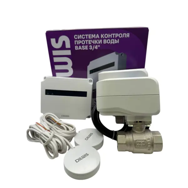 **Система DILWIS Base** - надежное решение для предотвращения затоплений и минимизации ущерба от протечек воды в доме или офисе. Комплект автоматически перекрывает подачу воды при обнаружении влаги, оперативно реагируя на аварийные ситуации. Устройство подойдет для установки в квартирах, частных домах, на дачах и в коммерческих помещениях - везде, где важна безопасность инженерных коммуникаций. Простая настройка и автономная работа системы позволяют обеспечить круглосуточную защиту без постоянного контроля со стороны пользователя. ### Преимущества: - комплектация из 2 кранов и 2 датчиков дает возможность защитить сразу две потенциально опасные зоны, например, кухню и ванную, обеспечивая комплексную безопасность ключевых точек водопотребления; - диаметр подключения 3/4″ соответствует стандартному размеру бытовых водопроводных труб, что упрощает монтаж системы без необходимости замены существующей разводки или установки переходников; - при срабатывании датчика краны автоматически б