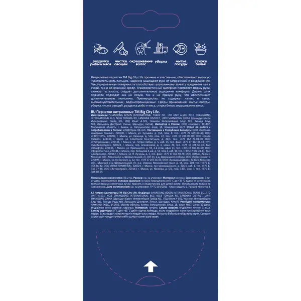 **Перчатки нитриловые Big City Life размер S** отличаются универсальным применением. Они подходят для разделки рыбы и мяса, чистки овощей, окрашивания волос, уборки, мытья посуды и стирки белья. При этом материал, из которого они выполнены, не снижает чувствительность пальцев и надежно защищают руки от загрязнений и раздражения. Текстурированная поверхность способствует улучшенному захвату предметов как в сухой, так и во влажной среде. Термоэластичный материал повторяет форму руки и создает дополнительное ощущение комфорта. Перчатки подходят как на левую, так и на правую руку, что обеспечивает дополнительную экономию. ### Особенности: - высокочувствительные; - водонепроницаемые; - отличаются высокой устойчивостью к химическим веществам, прочностью, эластичностью; - обеспечивают хорошее сцепление с поверхностью за счет текстурированной поверхности; - не содержат латекс и тальк; - универсальное применение; - подходят как для правой, так и для левой руки; - в упаковке: 10 шт.; - надежн