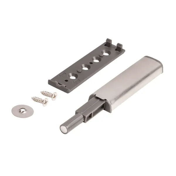 **Толкатель мебельный** - практичное решение для обустройства кухонных гарнитуров, шкафов-купе, офисных стеллажей и другой мебели, где требуется удобное открывание фасадов без использования ручек. Толкатель легко монтируется на мебельные фасады без необходимости специальных инструментов. Подходит для установки как на новые конструкции, так и при модернизации существующей мебели. Магнит в конструкции толкателя обеспечивает комфортное использование мебели и продлевает срок службы фурнитуры за счет равномерного распределения нагрузки при открывании и закрывании. ### Особенности: - изготовлен из прочного металла, обеспечивающего долговечность и надежность в эксплуатации; - компактные размеры позволяют устанавливать его в различные мебельные фасады, обеспечивая плавное и бесшумное открывание ящиков и дверец; - никелевое защитное покрытие придает изделию эстетичный внешний вид и защищает от коррозии; - размеры: 80 x 8 мм.