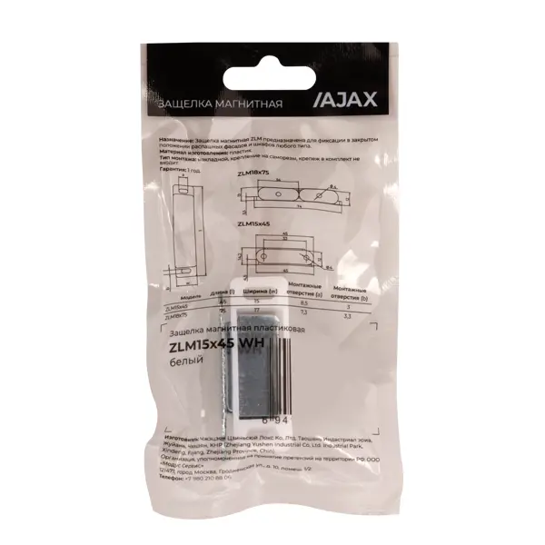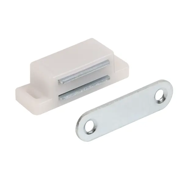 **Защелка магнитная** - мебельное крепежное изделие, изготовленное из комбинации пластика и металла. Устройство предназначено для автоматического фиксирования мебельных дверец в закрытом положении без использования дополнительных механизмов. Надежно удерживает двери шкафов, ящиков и других мебельных конструкций в закрытом состоянии. Благодаря магнитному механизму, дверца мягко и бесшумно закрывается, что особенно важно для офисной и домашней мебели. ### Особенности: - конструкция защелки включает пластиковый корпус и встроенный магнитный элемент, который обеспечивает надежное сцепление при закрытии; - компактные размеры в 15 x 45 мм позволяют устанавливать изделие на различные типы мебели без необходимости существенной доработки конструкции; - белый цвет корпуса гармонично сочетается с большинством мебельных фасадов; - защелка не требует дополнительного обслуживания и сохраняет свои свойства при нормальной эксплуатации; - монтаж осуществляется с помощью крепежных элементов, входящих в