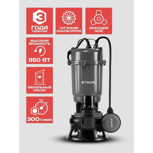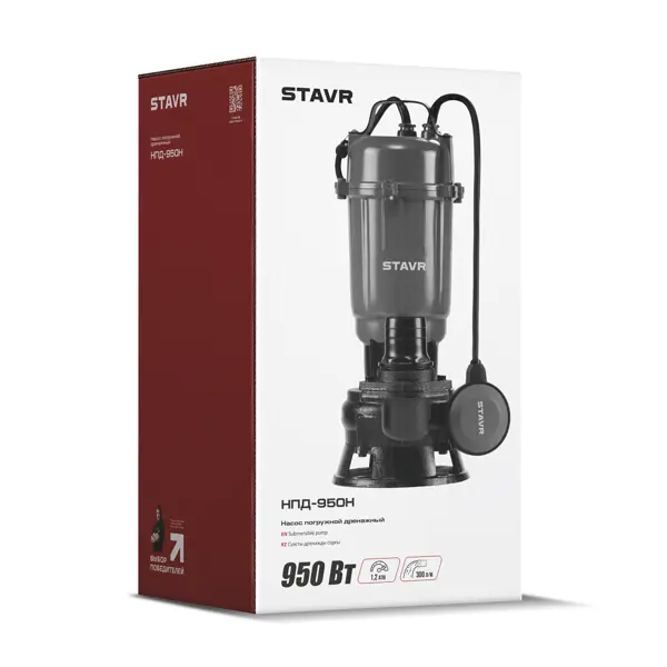 **Погружной дренажный насос НПД-950Н** предназначен для перекачивания воды и для решения различных задач по организации водоснабжения и водоотведения. Устройство эффективно справляется с задачами по осушению лодок и яхт, организации систем полива, а также откачке сточных вод в бытовых условиях. ### Особенности: - оснащен мощным электрическим двигателем мощностью 950 Вт, работающим от стандартной сети 220 В; - благодаря наличию специального режущего механизма насос способен измельчать небольшие твердые частицы и длинноволокнистые включения, такие как бумага, солома или волосы; - чугунный корпус обеспечивает надежную защиту от механических повреждений и коррозии; - максимальная производительность достигает 18 м³/ч, а высота подачи воды составляет 12 м; - устройство способно работать на глубине до 5 м и перекачивать воду с температурой до 35 градусов; - безопасность эксплуатации обеспечивается автоматическим поплавковым выключателем, который отключает насос при критическом снижении уровн