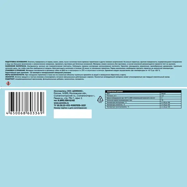 **Герметик акриловый Cemmix** - специализированный строительный материал для герметизации швов и стыков в различных конструкциях. Этот универсальный состав предназначен для работы с широким спектром материалов, включая дерево, металл, камень, керамику, бетон, пластик и стекло. Основное применение герметика охватывает внутренние и наружные работы: заделка швов в ванных комнатах, санузлах, оконных проемах, а также виброизоляционные работы. Благодаря особым свойствам материал эффективно защищает от проникновения влаги и компенсирует вибрационные нагрузки. ### Особенности: