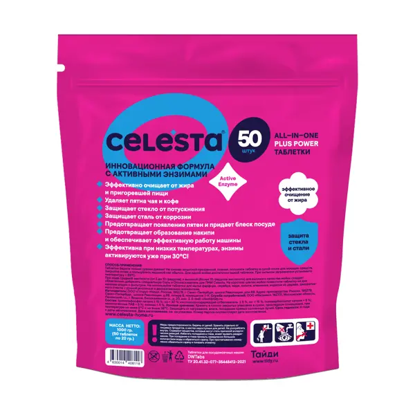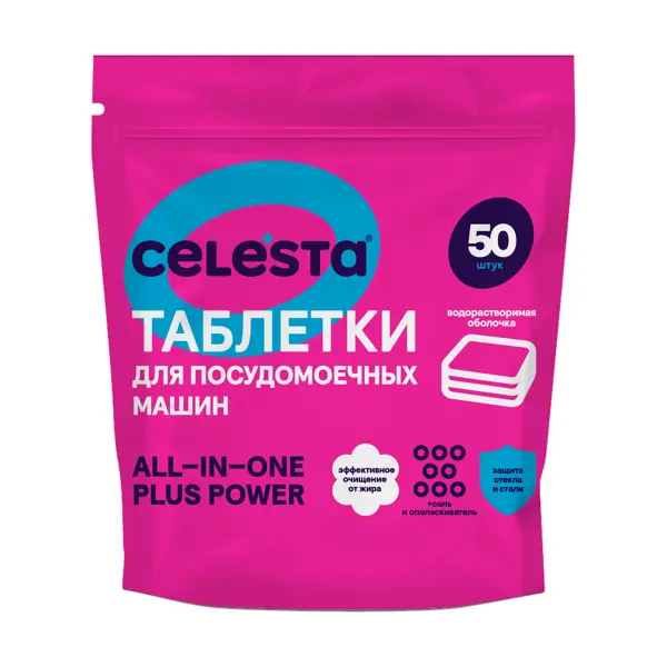 **Таблетки для ПММ Celesta**— идеальный выбор для ежедневного качественного очищения посуды. Благодаря продуманной формуле All-in-One Plus Power («всё в одном») достаточно использовать всего 1 таблетку, чтобы удалить жир, остатки пищи и другие загрязнения даже при стандартных режимах мойки посудомоечной машины. В процессе работы ПММ средство полностью растворяется в воде, обеспечивая быстрое и равномерное действие активных компонентов. Оно не оставляет следов на стеклянной и металлической посуде и гарантирует ее аккуратный внешний вид. Таблетка рассчитана на одно применение. Перед использованием не потребуется снимать с нее оболочку. Упаковки с 50 таблетками хватит на длительное время. ### Особенности: - формула All-in-One Plus Power («всё в одном») гарантирует безупречно чистую посуду без использования дополнительных средств; - подходят для керамики, пластика, стекла и нержавеющей стали; - не оставляют разводов на стеклянной посуде и защищают металлическую утварь от коррозии; - пре