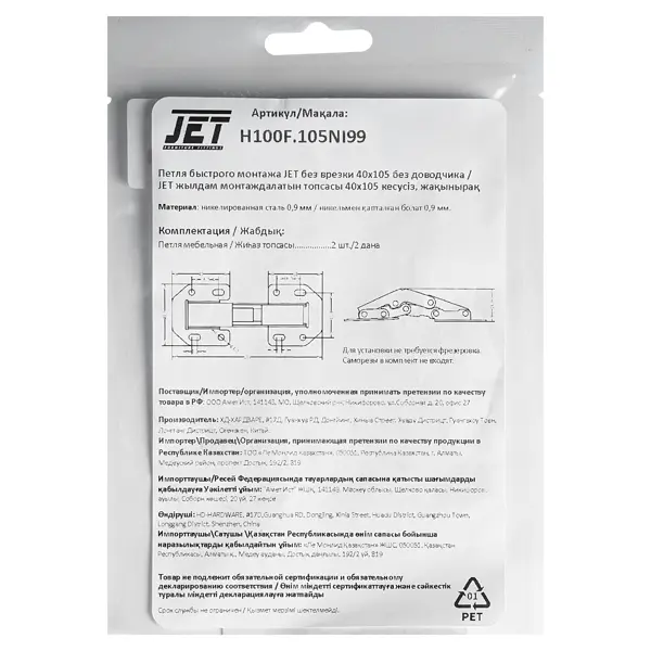 **Петля быстрого монтажа Jet** - это мебельный крепежный элемент, предназначенный для установки дверей шкафов, тумбочек и другой корпусной мебели. Комплект включает две петли, что достаточно для монтажа одной распашной двери. Обеспечивает надежное крепление мебельных дверей и их плавное открывание-закрывание. Петля позволяет быстро и без сложной врезки установить дверцу на корпус мебели. ### Особенности: - материал изготовления - прочная сталь, которая обеспечивает долговечность и надежность конструкции; - имеет специальное покрытие серебристо-серого цвета, защищающее от коррозии; - система быстрого монтажа существенно упрощает установку по сравнению с традиционными петлями; - предусматривают возможность регулировки положения двери после установки; - рассчитана на регулярные нагрузки при повседневном использовании; - подходят как для домашней, так и для офисной мебели; - размеры: 40 x 105 мм.