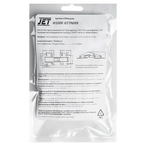 **Петля быстрого монтажа Jet** - это мебельный крепежный элемент, предназначенный для установки дверей шкафов, тумбочек и другой корпусной мебели. Комплект включает две петли, что достаточно для монтажа одной распашной двери. Обеспечивает надежное крепление мебельных дверей и их плавное открывание-закрывание. Петля позволяет быстро и без врезки установить дверцу на корпус мебели. ### Особенности: - материал изготовления - прочная сталь, которая обеспечивает долговечность и надежность конструкции; - имеет специальное покрытие серебристо-серого цвета, защищающее от коррозии; - система быстрого монтажа существенно упрощает установку по сравнению с традиционными петлями; - предусматривают возможность регулировки положения двери после установки; - рассчитана на регулярные нагрузки при повседневном использовании; - подходят как для домашней, так и для офисной мебели; - размеры: 33 x 77 мм.