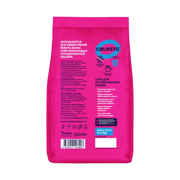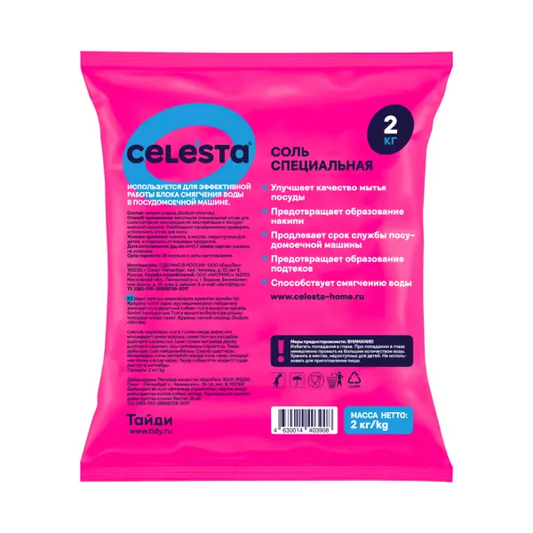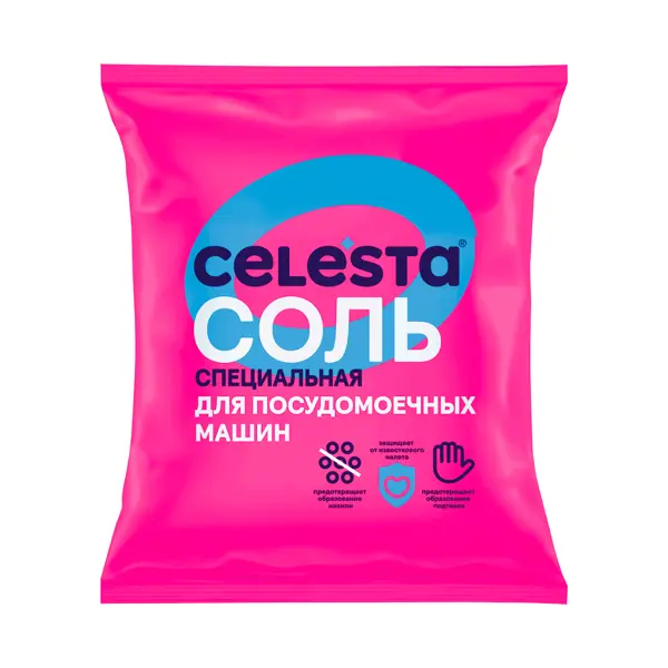 **Соль для посудомоечной машины Celesta 2 кг** улучшает качество мытья посуды, предотвращает образование накипи, подтеков и известкового налета. Она необходима для смягчения жесткости воды и продления срок службы посудомоечной машины. Заполните специальное отделение для соли в соответствии с инструкцией по эксплуатации посудомоечной машины. Своевременно проверяйте и пополняйте солевой отсек при каждом цикле очищения посуды в ПММ. Пользоваться средством рекомендуется каждый раз при очищении посуды в посудомоечной машине, чтобы избежать образования накипи на рабочих механизмах устройства. 2 кг соли хватит на длительное применение. В процессе использования она полностью растворяется. Подходит для всех типов посудомоечных машин. ### Особенности: - качественно и эффективно очищает посуду от известкового налета и накипи; - предотвращает образование накипи на рабочих механизмах посудомоечной машины, что продлевает ее срок службы и обеспечивает безупречную работу; - подходит для посудомоечны