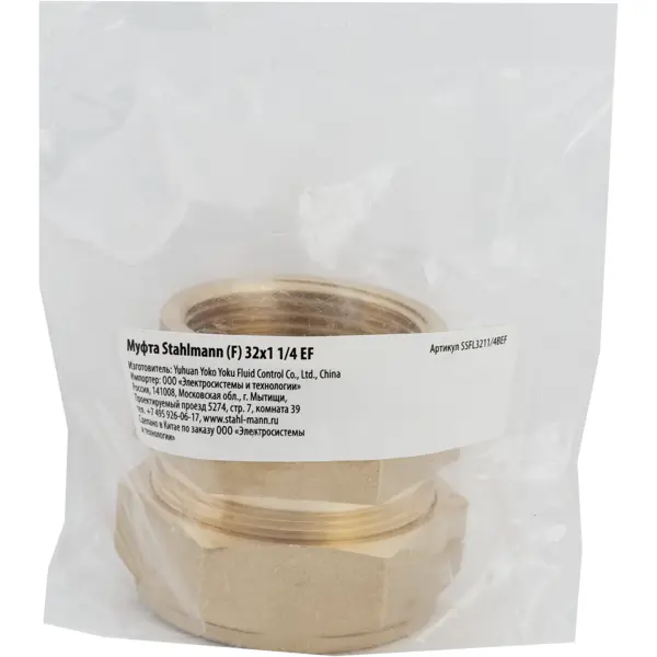 **Муфта обжимная Stahlmann** используется как переходник с систем нержавеющих гофрированных труб на другие. Соединение осуществляется при помощи резьбы. ### Особенности: - тип резьбы — внутренняя; - размер — 32 x 1 1/4" мм; - изготовлена из латуни.