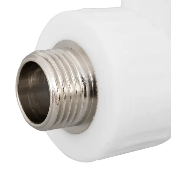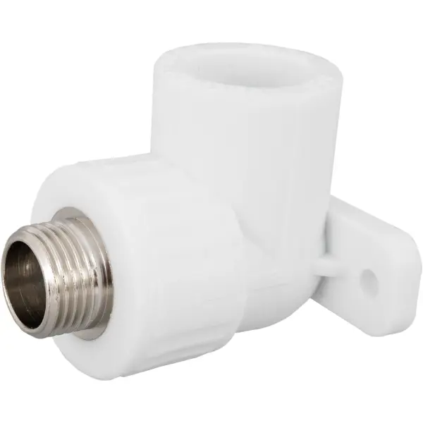 **Угол комбинированный с креплением** — белый полипропиленовый фитинг длиной 6,6 см с короткой крепежной планкой. Используется для перехода под углом 90° с полипропиленовой трубы на металлическую: возможен вариант подключения сантехники с фиксацией отвода к стене. У гладкого отверстия входной диаметр 25 мм, у резьбового посадочного места размер 1/2". Сочетание монтажного соединения — наружное/под пайку. Фитинг подходит для сетей с максимальной температурой 90 °C и давлением до 25 бар (горячее водоснабжение, система отопления и кондиционирования, питьевая вода).