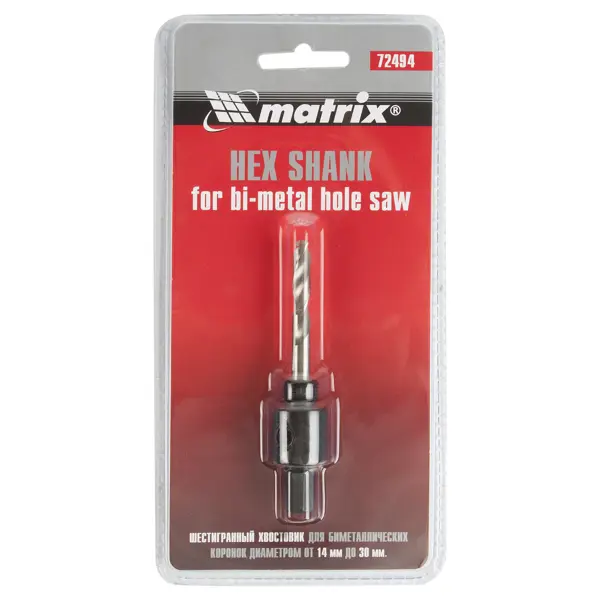 **Адаптер для коронок по металлу Matrix** (он же «оправка») с одной стороны имеет шестигранный хвостовик (вставляется в патрон электродрели), с другой стороны — резьбу, чтобы подсоединить режущий инструмент (коронку). Подходит для коронок диаметром 14-30 мм. Размер посадочной резьбы - М16. В комплекте с адаптером идет центрирующее сверло. Оно необходимо для точного центрирования коронки: при работе инструмент намечает центр круга, который надо высверлить.